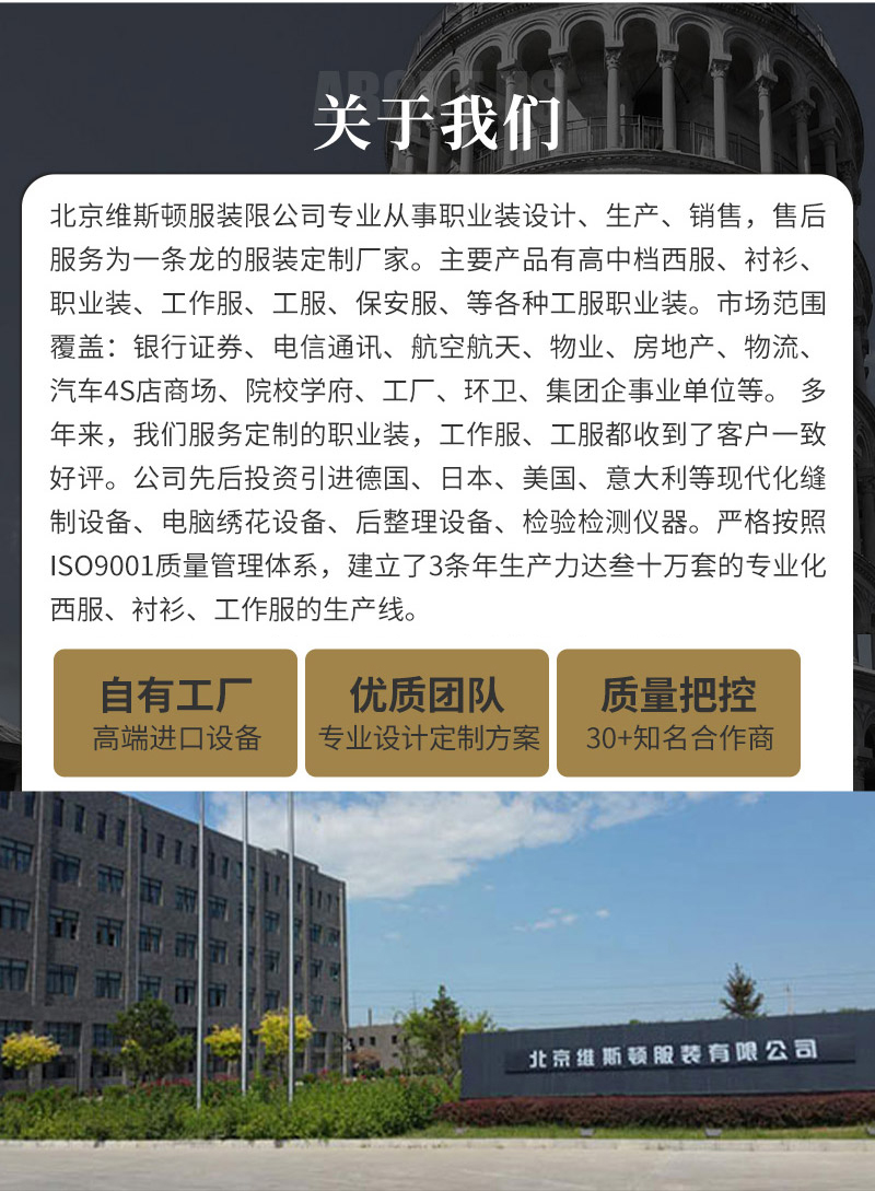 北京維斯頓服裝有限公司專(zhuān)業(yè)從事定制西服、職業(yè)裝、制服、工作服、工服、工裝、保安服、襯衫、夾克、西裝、商業(yè)裝、護(hù)士服、校服、保潔服、學(xué)生服、工程服、男式西服、女士西服、特體西服等。維斯頓品牌斯蒂維紳