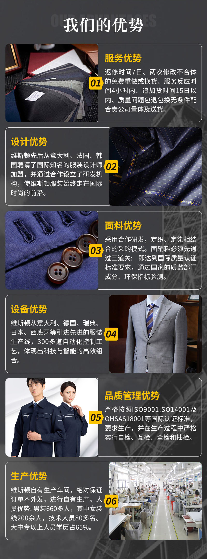 通過(guò)服務(wù)優(yōu)勢(shì)、設(shè)計(jì)優(yōu)勢(shì)、面料優(yōu)勢(shì)、設(shè)備優(yōu)勢(shì)、品質(zhì)管理優(yōu)勢(shì)、生產(chǎn)優(yōu)勢(shì)等全方位制作高品質(zhì)定制服裝,以此來(lái)強(qiáng)化對(duì)產(chǎn)品、品牌的體驗(yàn)認(rèn)知!